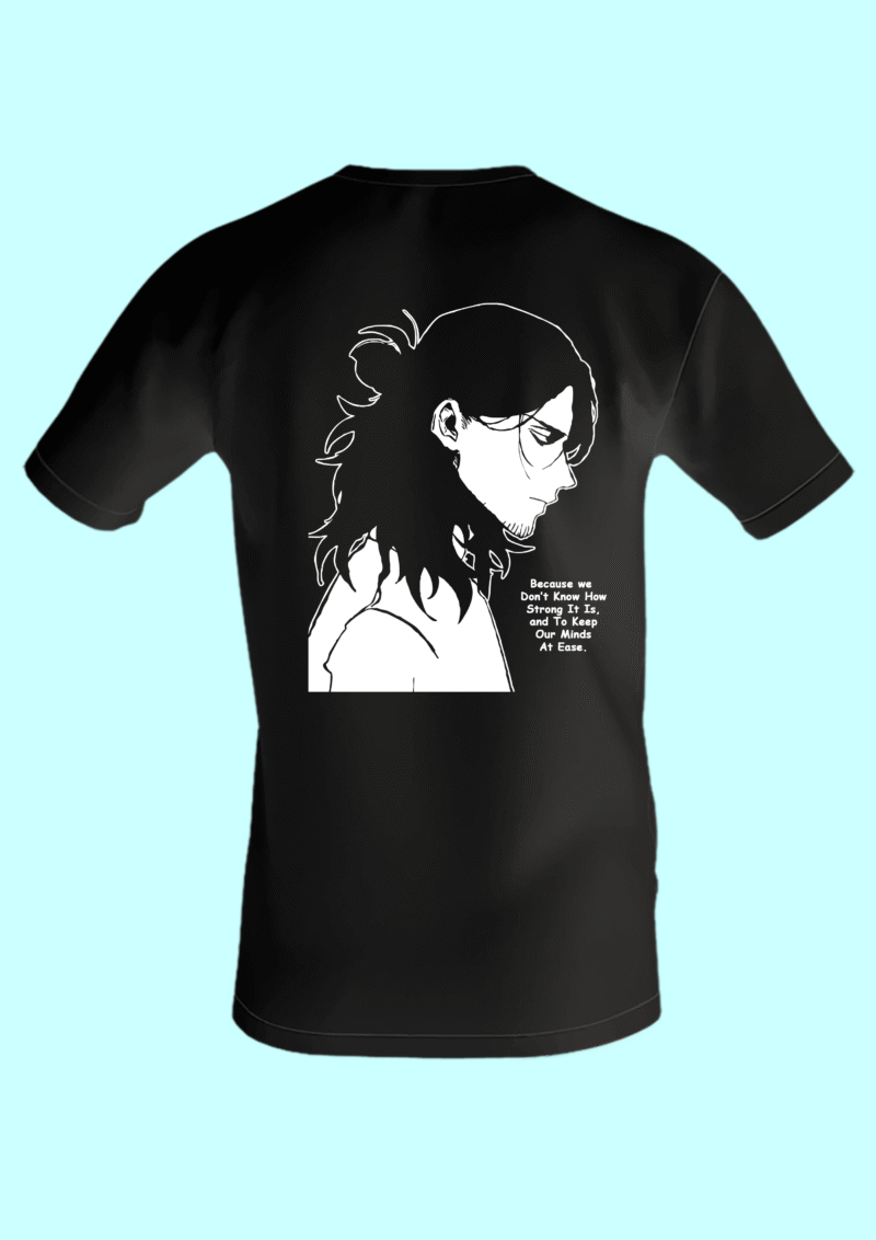 The back features a monochrome silhouette of Shota Aizawa, hair tied back in his signature no-nonsense style. Beneath it, his iconic quote reminds you to stay grounded in uncertainty. Whether you’re at a convention, hanging out with friends, or teaching your own version of “hero lessons,” this shirt lets you wear Aizawa’s quiet power with pride.