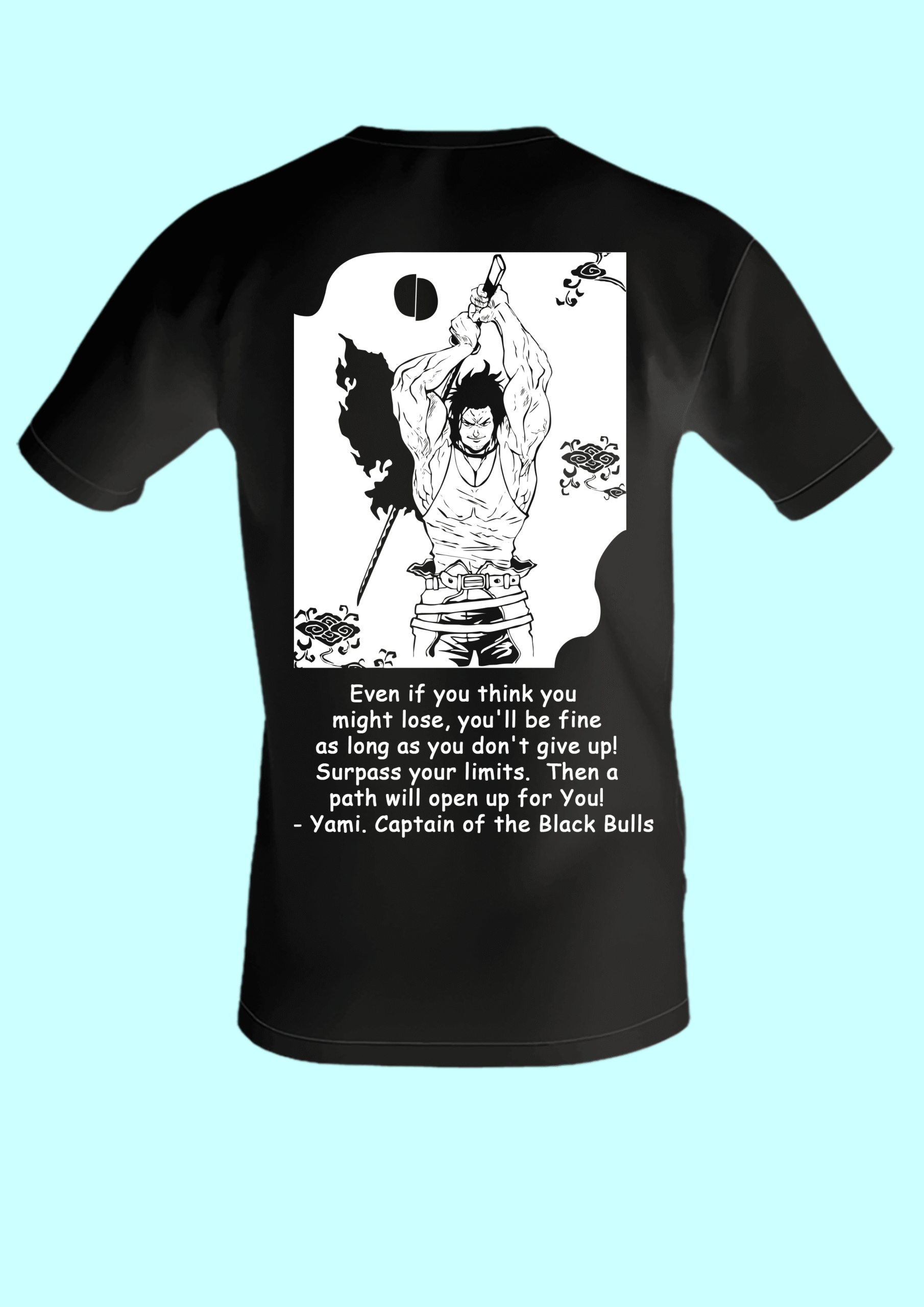 Experience the Magic of Manga with our premium T-shirts, available in Black and White. Each shirt is adorned with detailed artwork from beloved Black Clover and Beloved Yami, He is a Lone wolf once and a certain someone believed and give him the title of Blackbulls then created the group of misfits of Magic society and now they became the most fearsome Group.